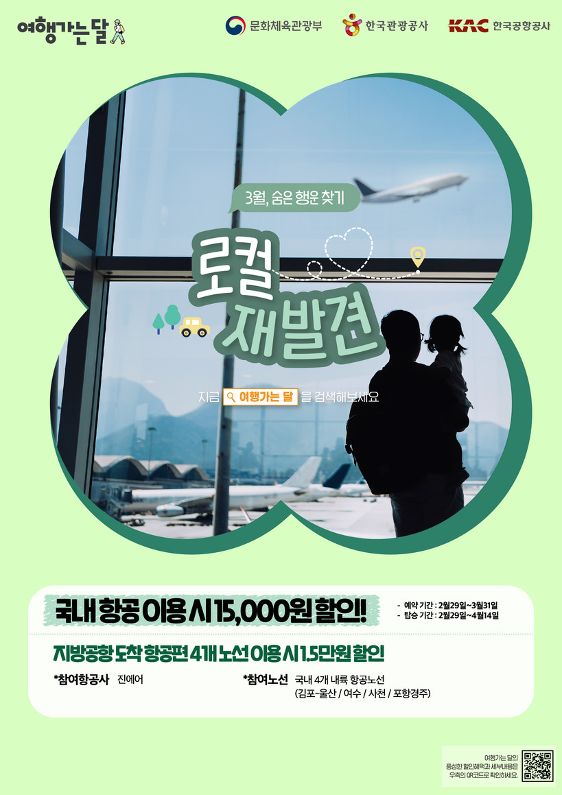[일요주간=김영란 기자] 한국공항공사(사장 윤형중)는 '3월 여행가는 달'을 맞아 문화체육관광부, 한국관광공사, 진에어와 함께 봄철 여행객들을 위한 내륙노선 항공권 할인 프로모션을 실시한다.