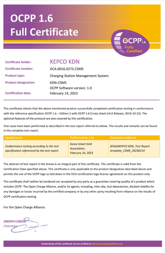 한전KDN은 OCPP 인증기관인 한국스마트그리드협회를 통해 인증을 취득함으로써 전기차 충전기술의 우수성을 다시 한 번 인정받은 것이다.