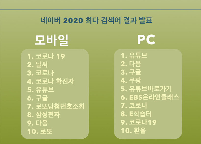 또 네이버 PC에서 최다 검색어는 작년에 이어 '유튜브', '다음', '구글'이 나란히 1, 2, 3위를 차지했다. 모바일과 마찬가지로 코로나바이러스감염증-19 관련 검색어인 '코로나'(7위), '코로나19'(9위), '코로나확진자'(19위) 도 상위를 차지했다.