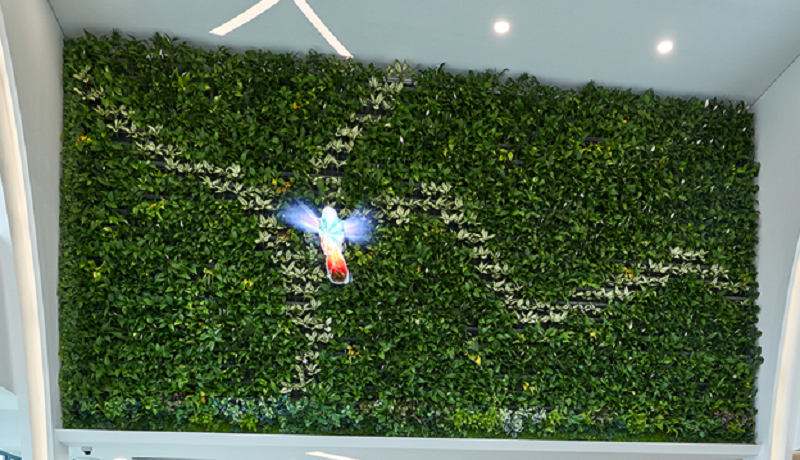 ▲ 홀로그램(Hologram) : 8개의 홀로그램 바(Bar)가 고속으로 회전하여 실물영상을 구현하는 디지털 영상 장치_ ※ (배경) 수직정원 : 공기정화 식물을 벽에 식재하고, 4대의 산소발생기를 가동하는 그린월(사진=한국도로공사) |