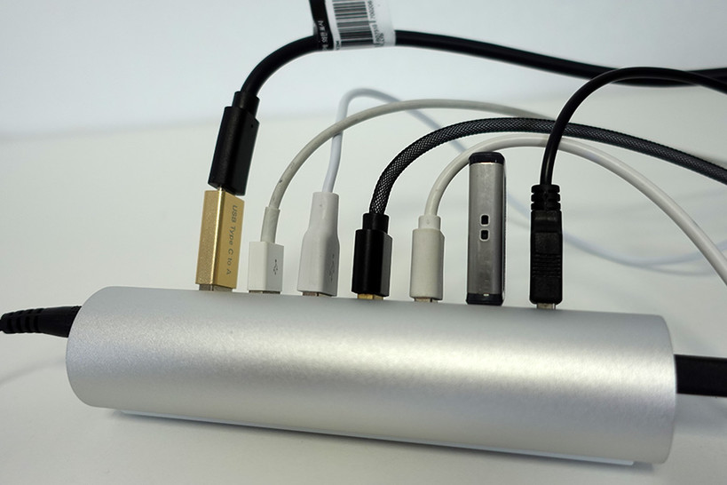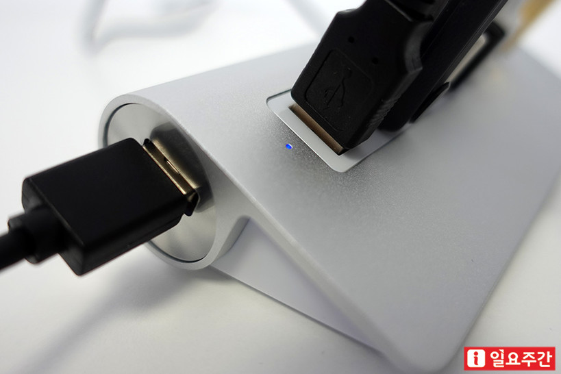 바로 왼쪽면에 위치한 포트가 컴퓨터와 연결되는 포트로 기본은 USB-A 타입 케이블이 제공되지만 요즘 스마트폰의 연결 케이블로 제공되는 USB-C 타입 케이블을 연결한다면 연결단자가 오로지 USB-C로만 제공되는 맥북 프로 계열에서도 7개의 포트를 모두 사용할 수 있다.