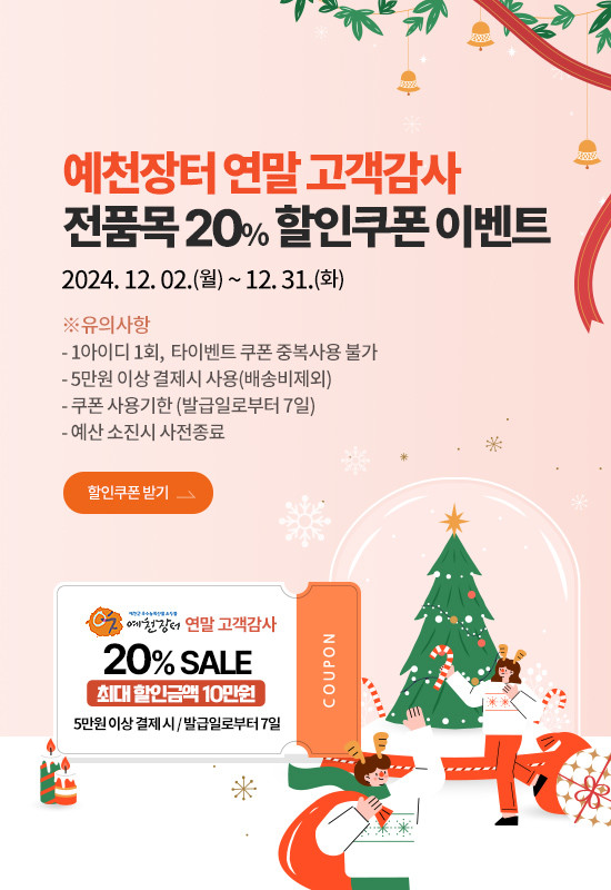 군은 예천장터 가입 회원대상을 대상으로 전 품목 20% 할인쿠폰을 지급한다. 이는 아이디 하나당 5만 원 이상 결제 시 1회 사용할 수 있다. 최대 구매할인 금액은 10만 원으로 폭넓은 할인가를 제시한다.