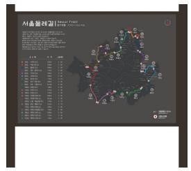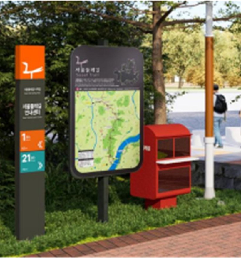 또한 통일된 색상과 디자인으로 ‘서울둘레길 안내판’을 정비하고 코스가 변경되는 기점에는 이용자가 정보를 한눈에 확인할 수 있도록 시종점안내판, 스탬프함, 코스 안내판을 한데 모아 설치한다. 외국인 탐방객을 위해 한글 외에도 영어, 중국어, 일본어도 표기한다.