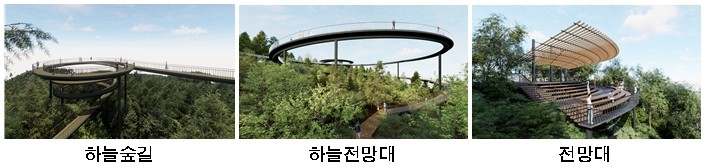 권역별 특성에 맞춰 하늘쉼터, 하늘전망대, 무인휴게소 등 거점형 산림휴양 여가시설을 조성하고 변화하는 산림 여가 트랜드와 국내외 관광객을 고려해 캠핑시설(숙박.비박)과도 연계하는 한편 다양한 시선에서 숲을 조망하고 관찰할 수 있게끔 높이 10m 내외의 ‘하늘숲길’도 조성할 계획이다. 또 숲길에서 간단한 간식 등을 구매할 수 있는 무인휴게소도 설치할 예정이다.