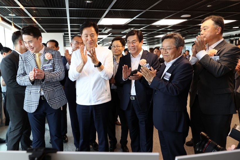 ▲ 오언석 도봉구청장(왼쪽부터), 오세훈 서울시장, 김선동 국민의힘 위원장, 김헌동 SH공사 사장, 유병태 HUG 사장이 49층 시설을 둘러보고 박수를 치고 있다. (사진=SH공사) |