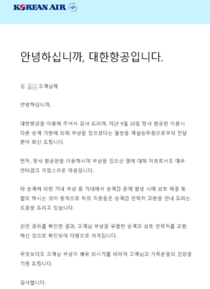 대한항공은 지난달 28일 A 씨에게 보낸 이메일 답변을 통해 “당사 항공편을 이용하며 부상을 입으신 점에 대해 매우 안타깝고 걱정스러운 마음이다. 다른 승객에 의해 기내 부상 등 기내에서 승객 간 문제 발생 시에 상호 해결과 합의하는 것이 원칙으로 저희 직원들은 승객 간 연락처 교환을 안내드리는 도움을 드리고 있다”고 했다.