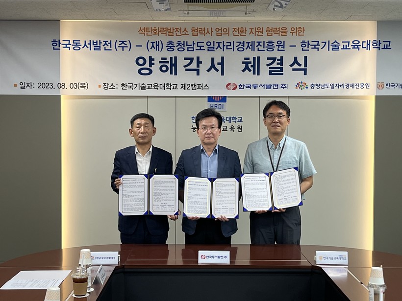 [일요주간=김영란 기자] 한국동서발전(주)(사장 김영문)는 석탄발전소 상주 협력사 근로자의 일자리 전환을 위해 충청남도 일자리경제진흥원, 한국기술교육대학교와 ‘협력사 업의 전환 지원’ 공동협약을 3일(목) 오후 1시 충남 천안시 한국기술교육대학교에서 체결했다.