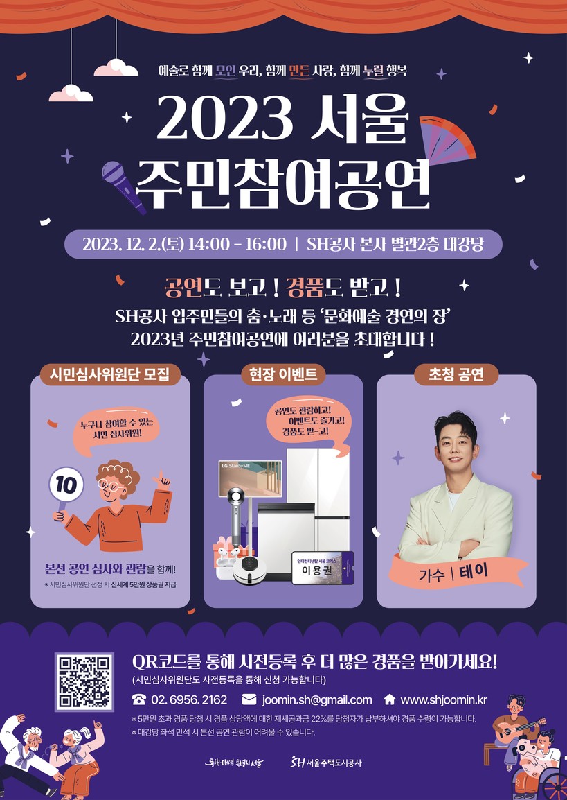 [일요주간=김영란 기자] 서울주택도시공사(SH공사, 사장 김헌동)는 12월 2일 누구나 참여해 함께 즐길 수 있는 문화행사 ‘2023년 서울 주민참여공연’을 개최한다.