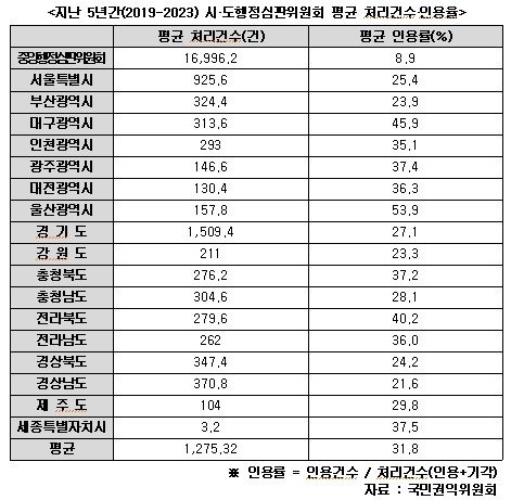 특히, 시·도 행정심판위원회의 경우 지역별 평균 인용률 편차가 더 컸다. 울산광역시는 인용률이 53.9%인 반면 경상남도는 21.6%를 기록해 그 차이가 32.3%나 됐다. 그밖에 대구광역시와 전라북도도 각각 45.9%, 40.2%로 높은 인용률을 보였다. 이는 2명 중 1명이 행정 처분을 취소받은 셈이다.