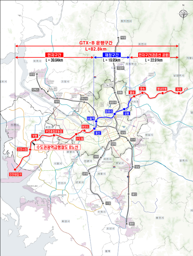 GTX-B노선은 수도권 주요 거점역을 30분대로 연결하는 광역급행철도로 인천 송도국제도시에서 출발해 인천시청, 부평, 서울 등을 경유하고 남양주 마석까지 연결하는 전체 길이 82.8㎞, 정거장 14개소가 건설된다. 2030년 개통이 목표다.
