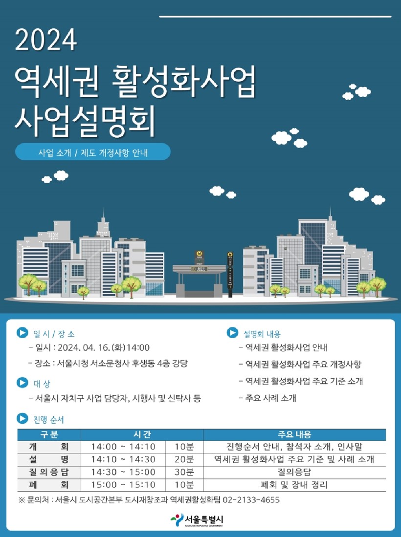 서울시는 역세권 활성화 사업의 원활한 추진과 적극적인 참여 유도를 위한 ‘역세권 활성화 사업 설명회’를 4.16.(화) 14시 서소문청사 후생동(4층 강당)에서 개최한다고 밝혔다. 자치구 공무원, 사업시행자, 신탁사 등 역세권 활성화 사업에 관심 있는 누구나 참여할 수 있다.