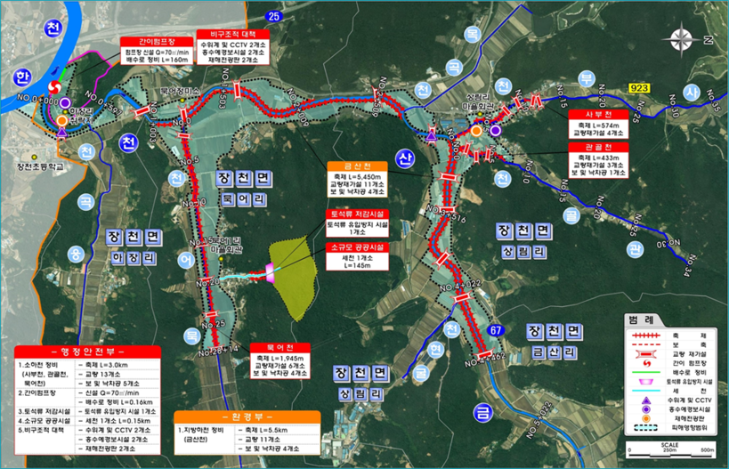 장천지구 풍수해생활권 종합정비사업은 482억 원을 투입해 장천면 상림리, 묵어리, 하장리 일대 하천 8.4km를 정비하고, 24개의 교량과 간이펌프장 설치를 통해 재해 취약지의 침수 피해를 근본적으로 해소하는 사업이다.