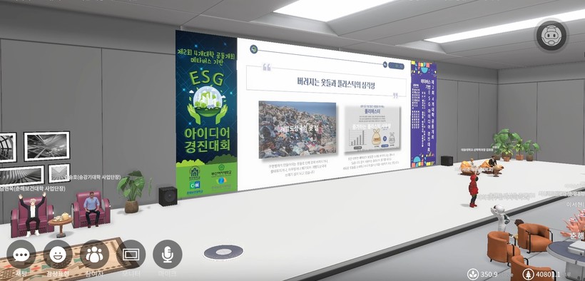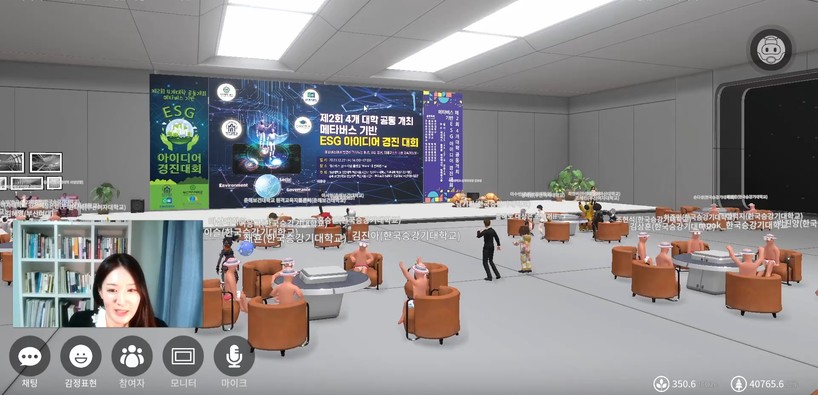 실제 모든 참가자들은 연구실과 사무실, 집, 강의실 등에서 온라인 접속을 통해 참가했으며, 학생들이 준비해 온 아이디어를 자료 화면과 음성 송출을 통해 감상했다. 대학교수, 언론사 ESG 담당 기자, 대기업 ESG팀 임원 등으로 꾸려진 심사위원들도 메타버스 플랫폼에 접속해 학생들이 준비한 아이디어를 평가하고 보완 발전 방안을 제시하며 대회에 열기를 더했다.
