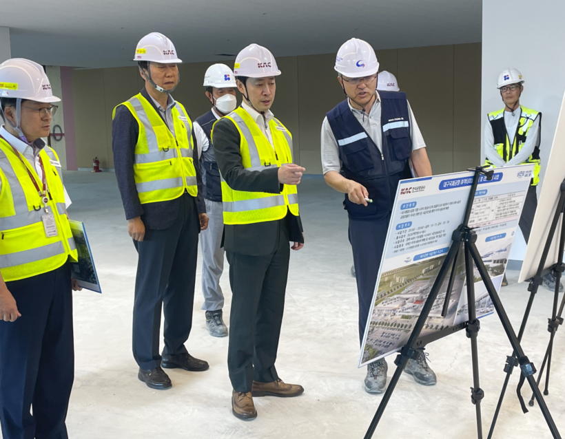 ▲ 3일, 윤형중 한국공항공사 사장이 대구국제공항 국내선 여객터미널 공사현장을 방문해 안전관리실태를 점검하고 있다.(사진=공항공사) |