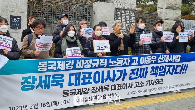 동국제강 비정규직노동자 산재사망사고 해결촉구 지원모임은 이날 기자회견을 통해 “검찰은 장세욱 동국제강 대표이사를 철저하게 수사해 기소하라”고 촉구했다.