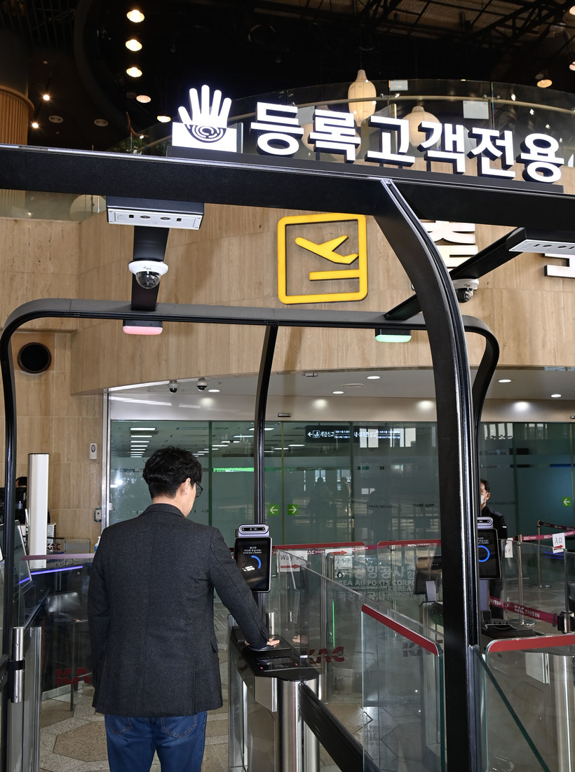 | ▲ 공항이용객이 바이오 인증을 통해 탑승수속을 하고 있다.(사진=한국공항공사) |