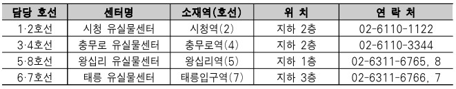 ▲ 유실물센터 위치 및 연락처(표=서울교통공사) |