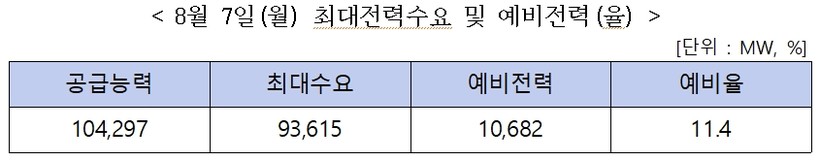 ▲ 8월 7일(월) 최대전력수요 및 예비전력(율) (표=전력거래소) |