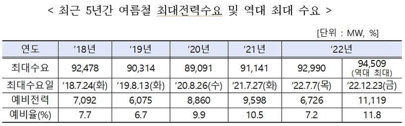 ▲ 최근 5년간 여름철 최대전력수요 및 역대 최대 수요(표=전력거래소) |