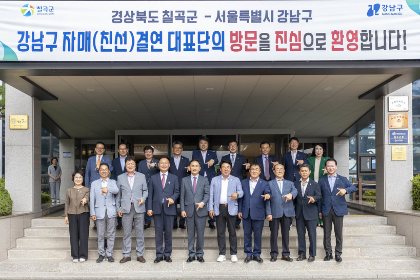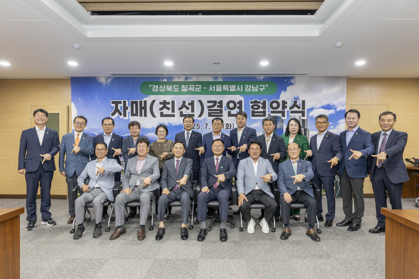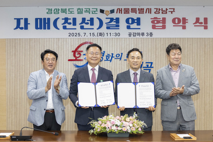 [일요주간=최부건 기자] 경상북도 칠곡군(군수 김재욱)은 지난 7월 15일, 칠곡군청 공감마루에서 서울특별시 강남구(구청장 조성명)와 자매(친선)결연 협약을 체결했다.