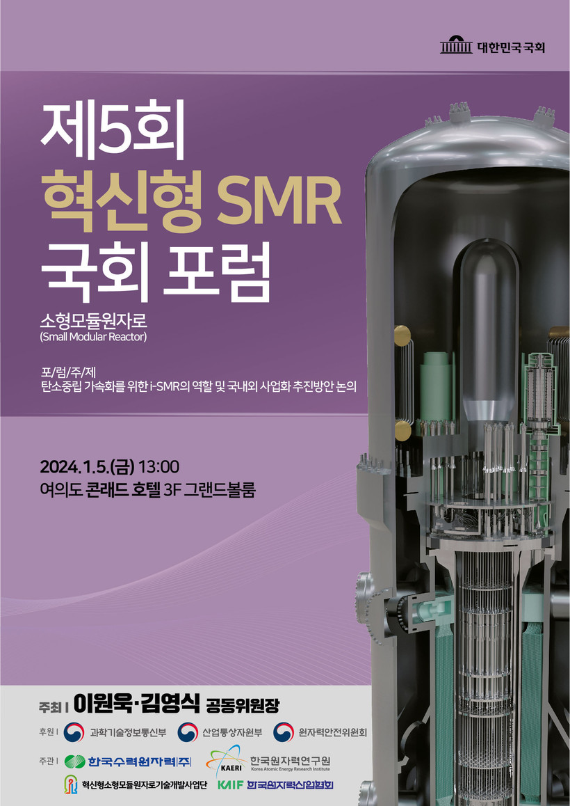 [일요주간=김영란 기자] 한국수력원자력(사장 황주호, 이하 한수원), 한국원자력연구원(원장 주한규), 혁신형소형모듈원자로기술개발사업단(단장 김한곤), 한국원자력산업협회(상근부회장 노백식)가 공동 주관하고, 국민의힘 김영식 의원(경북 구미시 을)과 더불어민주당 이원욱 의원(경기 화성시 을)을 공동위원장으로 하는 ‘제5회 혁신형 SMR(소형모듈원자로) 국회포럼’이 다음달 5일 13시 서울 여의도 콘래드호텔에서 열린다.