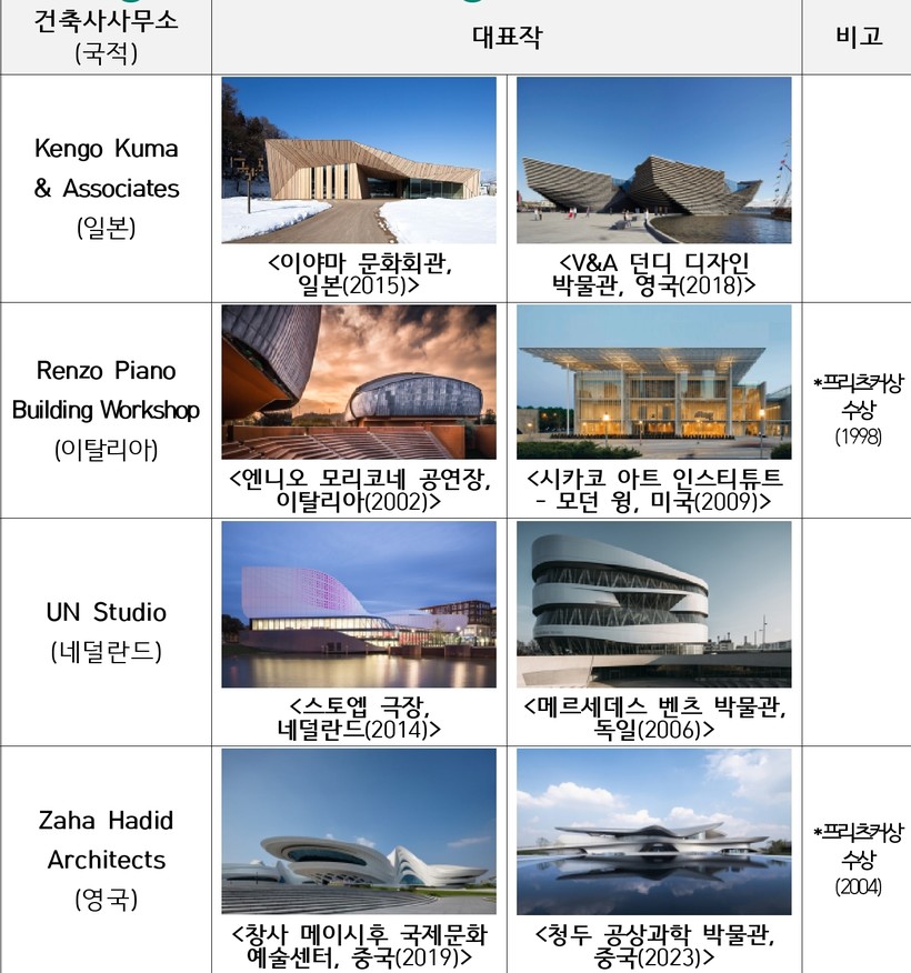 먼저 국외팀으로는 ▲Kengo Kuma & Associates(일본) ▲Renzo Piano Building Workshop(이탈리아) ▲UN Studio(네덜란드) ▲ Zaha Hadid Architects(영국) 총 4팀이 참여한다.