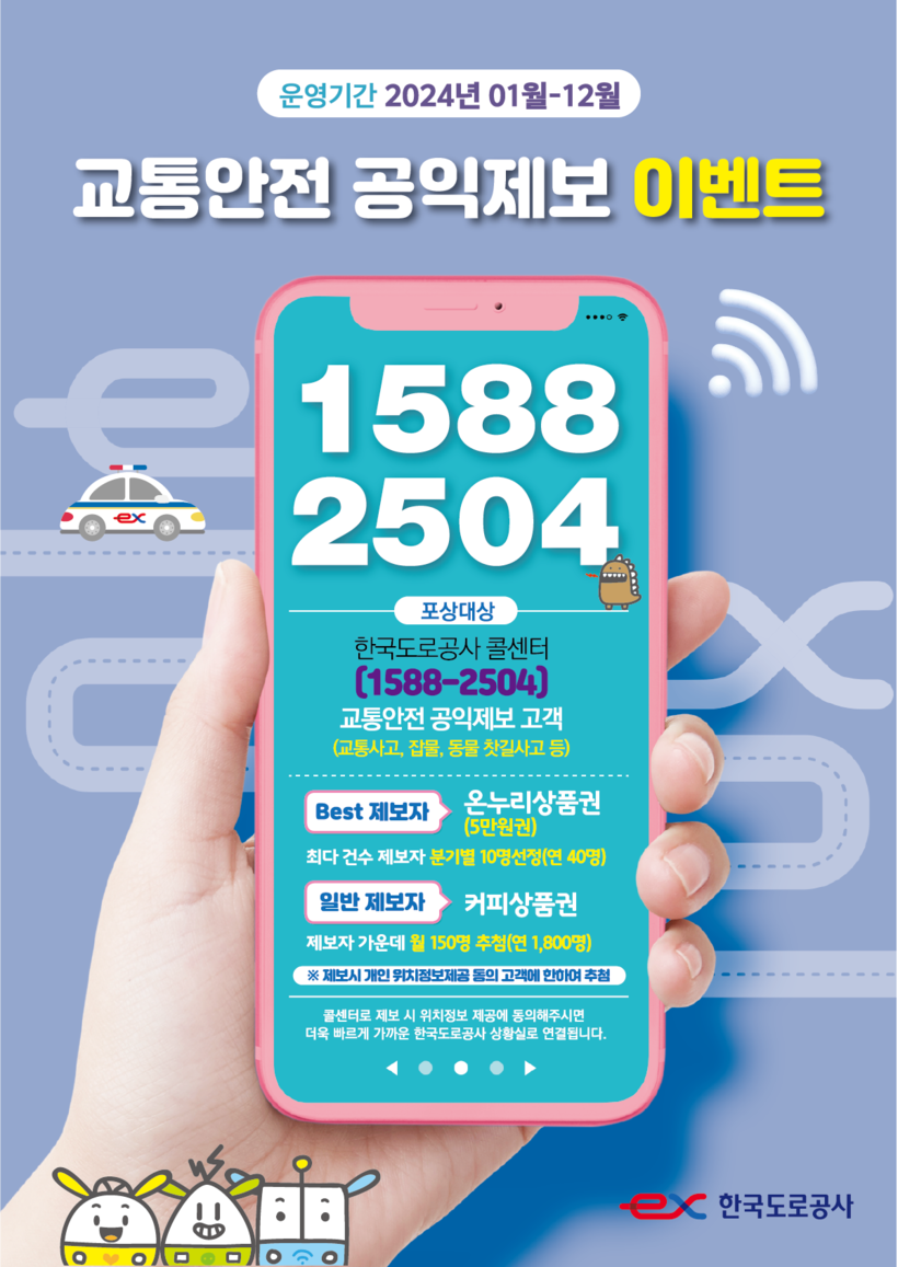 한국도로공사 관계자는 “고객 여러분의 제보가 빠른 조치로 이어져 교통사고 예방에 큰 도움이 되었기에 올해도 감사 이벤트를 진행하게 됐다”며, “제보 상황 발견 시 휴게소 등 안전한 장소에서 ‘1588-2504’ 로 제보해주시길부탁드린다”고 말했다.