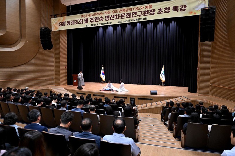 이날 특강은 군위군청 직원 250여 명이 참석한 가운데 진행됐다. 강연자로 나선 주인숙 명선다문화원장은 우리가 평소에 접하기 힘든 차의 기원과 종류, 차를 우리고 내리는 방법 시연, 한중일 다도의 차이점 등 다도 예법 강의와 우리의 전통 예절, 일상생활 속에 가져야 할 부부의 마음가짐 등을 알려주어 관심을 끌었다. 또한, 강의가 끝난 후에는 말차, 녹차, 황차를 시음하고, 다식 체험 시간을 가져, 직원들의 큰 호응을 얻었다.