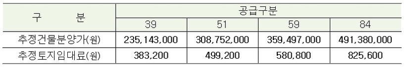 ▲ 마곡지구 16단지 특별공급 추정 건물분양가격 및 토지임대료 (표=SH공사) |
