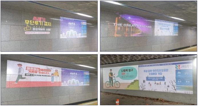 풍납토성·옥수·여의도·염창·노들길 나들목 5개소에 영상 콘텐츠를 송출할 수 있는 ‘무비젝터’를 작년 12월에 설치했다. 무비젝터를 통해 한강 눈썰매장 개장, 로맨틱 한강 크리스마스 마켓 등 한강공원에서 열리는 주요 행사를 비롯해 한강공원 이용 방법 등을 안내하는 다양한 홍보 영상을 송출하며 시민들과의 소통을 강화하고 있다. 향후 시민 호응도를 살펴본 뒤 그레이트 한강 프로젝트 등 더 다양한 정보를 제공할 계획이다.