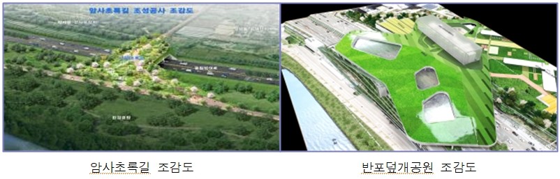 올림픽대로로 단절된 암사동 선사유적지와 한강을 녹지로 연결하는 ‘암사초록길’은 올해 폭 50m, 녹지 6,300㎡ 규모로 준공, 시민에게 개방한다. 올림픽도로와 반포 일대 주거지역을 연결하는 ‘반포덮개공원’도 올해 현상공모와 설계용역에 들어간다.