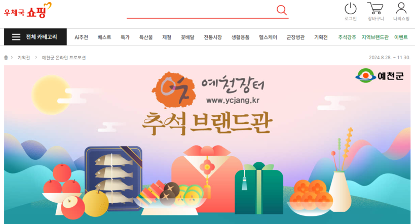 군은 『예천장터』를 통해 추석맞이 특판전(8.19.~9.12.)을 진행 중인 가운데, 전국적인 유통망을 보유한 우체국쇼핑몰과 손잡고 『예천군 브랜드관』을 개설해 메인 배너 노출, 특가 프로모션을 진행한다.