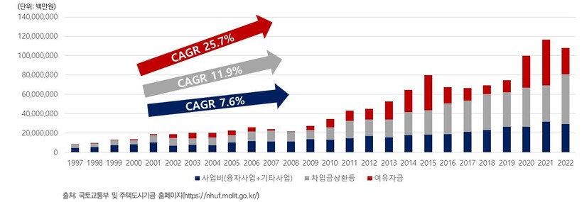 2000년 초반 약 20조 원이던 주택도시기금 연간 조성규모는 현재 약 100조 원을 훌쩍 넘어섰으며, 여유자금은 연평균 25.7%로 상승추세를 보이고 있다. 사업비의 증가폭보다 여유자금의 증가속도가 늘어나는 점에 비춰 볼 때 현 시점에서 3세대 주택도시기금 등으로 개편될 필요가 있다.