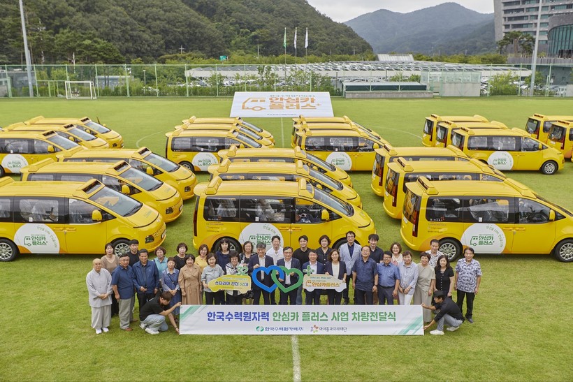 [일요주간=김영란 기자] 한국수력원자력(사장 황주호, 이하 한수원)이 28일 경주 본사에서 ‘안심카 플러스’ 차량 전달식을 열고, 전국 아동복지시설에 어린이 통학용 승합차 32대를 전달했다.