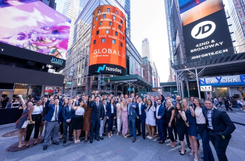 | ▲미국 나스닥 전광판 광고 앞에서 글로벌 X 직원들이 포즈를 취하고 있다. (사진=미래에셋자산운용) |