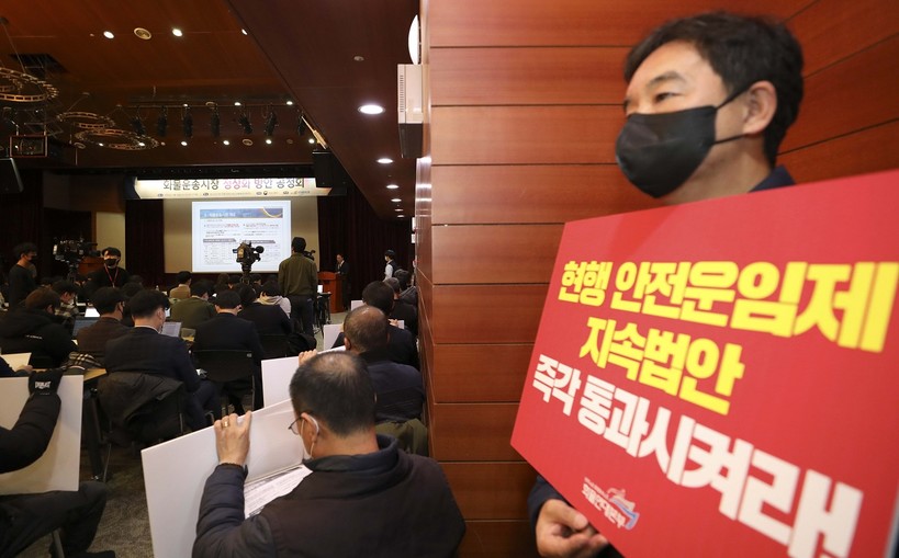 ▲ 민주노총 공공운수노조 화물연대본부 관계자가 18일 국토교통부 주최로 진행된 '화물운송시장 정상화 방안 공청회'에서 안전운임제 지속 촉구 피켓을 들고 있다. 사진=뉴시스 |