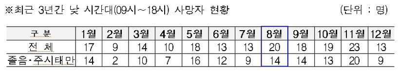 ▲ 최근 3년간 낮 시간대(09시∼18시) 사망자 현황(표=도로공사) |