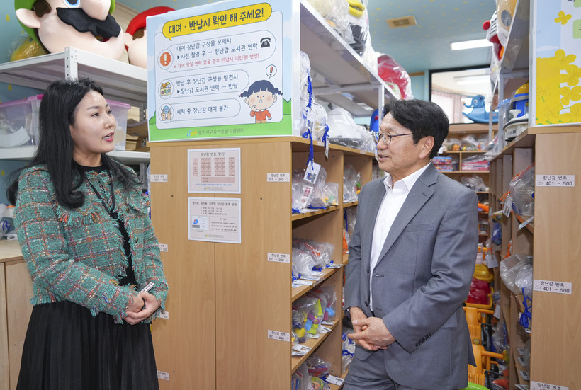 ▲ 강기정 광주광역시장이 27일 오후 서구 일가정양립지원본부에서 열린 '제34회 정책소풍'에 참석해 간담회에 앞서 센터 내부시설을 둘러보고 있다.(사진=광주광역시) |