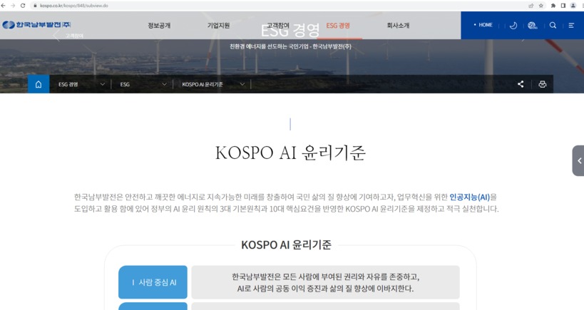 남부발전의 KOSPO AI 윤리기준은 정부의 AI 윤리 원칙인 3대 원칙과 10대 핵심 요건을 충실히 반영했으며, 인공지능 전문가(부산대 정보컴퓨터공학부 김호원 교수)의 자문을 받아 완성도를 높였다.
