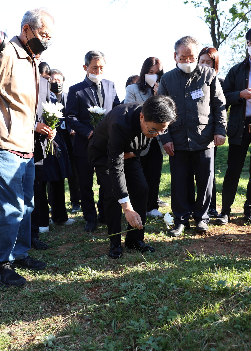 ▲ 2022년 10월19일 선감학원 유해 매장 추정지에서 헌화 및 묵념하는 김동연 지사 (사진=경기도) |