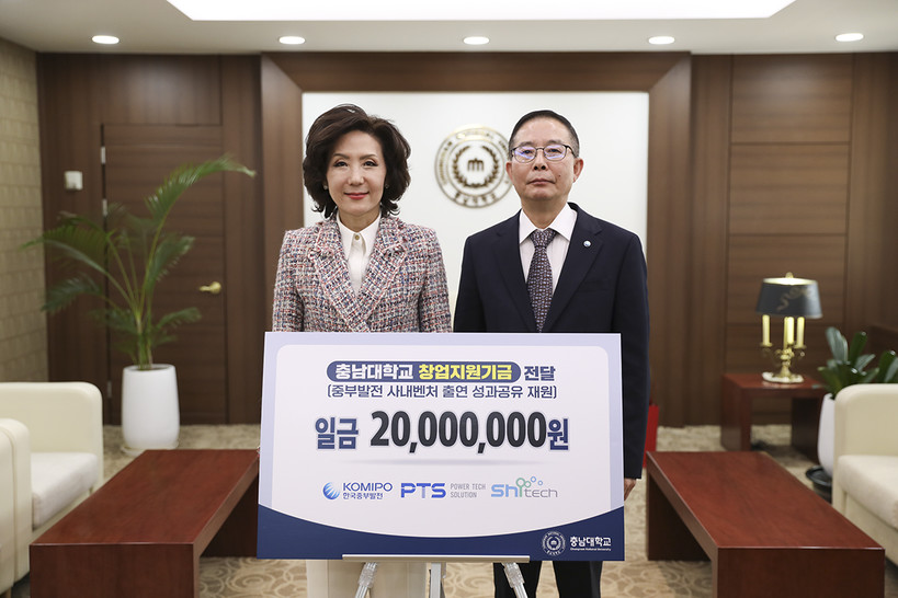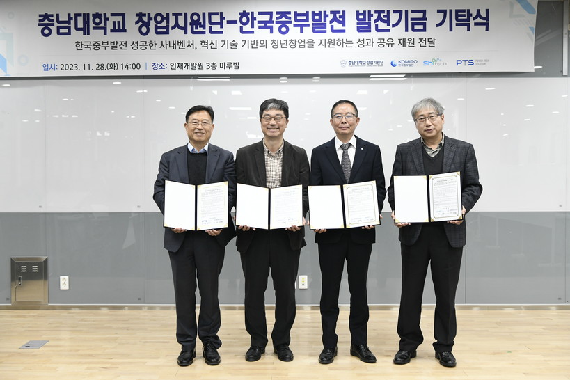 [일요주간=김영란 기자] 한국중부발전(주)은 11월 28일(화) 충남대 창업교육센터에서 사내벤처 독립분사 법인 SHI텍㈜, 파워테크솔루션㈜가 출연한 성과공유 재원(2천만원)을 활용하여 혁신기술 기반 청년창업 지원을 위한 기부 행사를 개최했다.