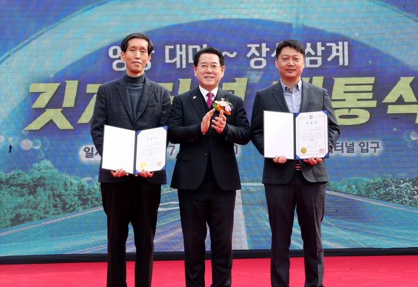 ▲ 깃재터널(영광~장성) 개통식_김영록 전라남도지사가 7일 오후 영광군 대마면에서 열린 영광과 장성을 새롭게 잇는 ‘깃재터널 개통식’에서 표창장을 수여한 뒤 기념촬영을 하고 있다. (사진=전남도) |