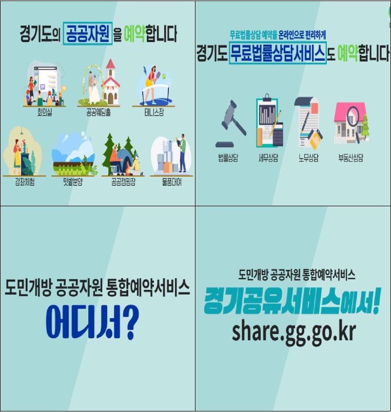 경기도는 2021년 1월부터 경기공유서비스를 구축해 도와 31개 시군, 공공기관에서 도민에게 개방하고 있다. 경기공유서비스는 강의실, 회의실, 체육시설 등 2,800여 개의 공공시설을 비롯해 강좌·체험, 텃밭분양, 물품대여, 공공웨딩홀 및 공공캠핑장 종합안내, 공유재산 대부신청, 무료법률상담 예약과 같은 다양한 예약 서비스를 제공하고 있다.