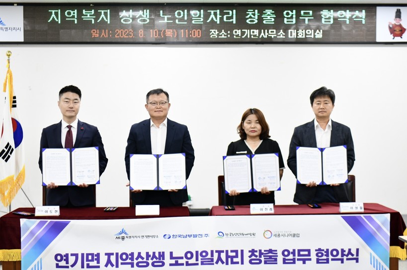 [일요주간=김영란 기자] 한국남부발전(주)(사장 이승우, 이하 ‘남부발전’) 신세종빛드림건설본부는 10일 세종특별자치시 연기면사무소 대회의실에서 연기면사무소, 한국노인인력개발원 세종충북지사, 세종시니어클럽과 공동으로 ‘취약계층 생활복지서비스 지원 노인일자리 창출 사업 업무협약’을 체결했다고 밝혔다.
