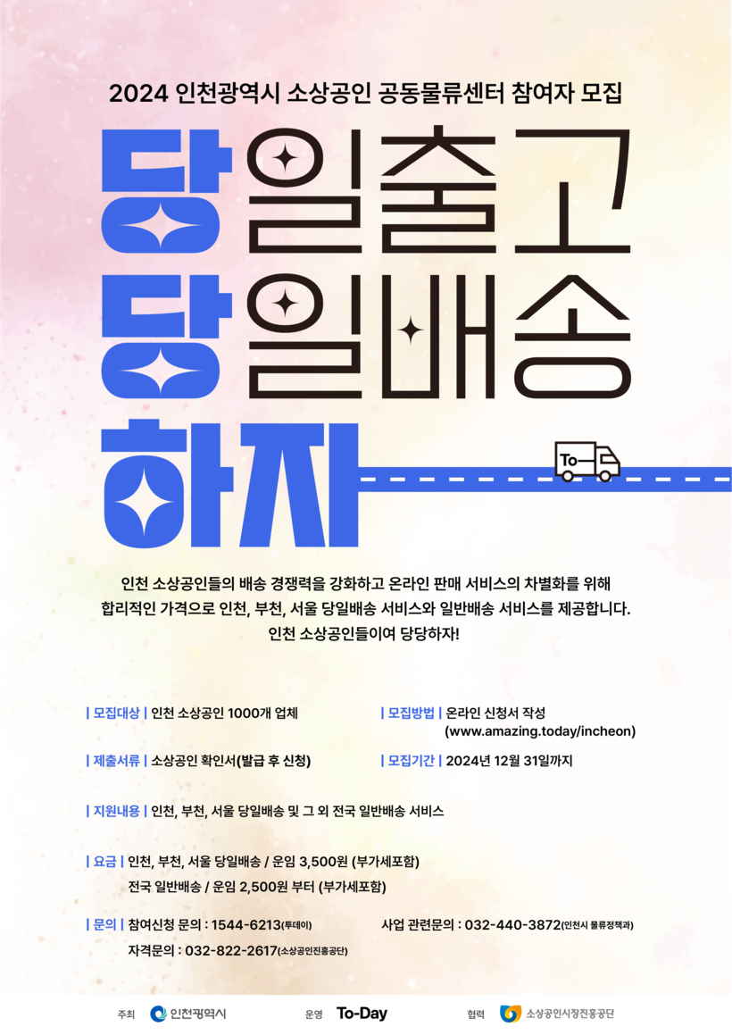 한편, 참가를 원하는 인천시 관내 소상공인은 소상공인 확인서를 발급 받은 후, 전화 1544-6213(투데이) 또는 인천시 홈페이지<인천소식 >새 소식(10039번)>에서 온라인으로 신청할 수 있다.