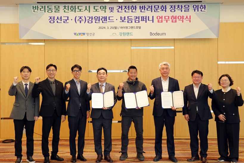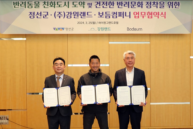 [일요주간=김영란 기자] 강원랜드(대표이사직무대행 최철규)가 산림관광 자원 활용을 통한 반려견 동반 여행객 유치를 목적으로 정선군(군수 최승준), 보듬컴퍼니(대표 강형욱)와 업무협약을 체결했다고 25일 밝혔다.