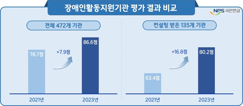 2022년에는 135개 활동지원기관을 대상으로 컨설팅을 시행했으며, 이들 기관의 2023년 평균 점수는 80.2점으로 2021년 63.4점보다 16.8점 상승하였다.