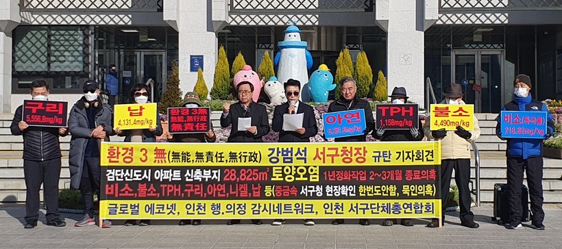 김 상임회장은 “제일풍경채를 분양받은 분들이 토양오염에 대해 우려에 전화도 온다. 주민 건강 보호와 환경, 안전을 빈틈없이 챙겨야 할 서구청장은 무슨 생각으로 구정에 임하는 답답하다 못해 불안하다”며 강범석 서구 구청장 사퇴를 재차 촉구했다.