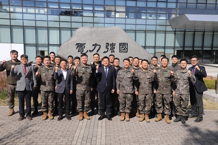 ▲ 한미엽합사령부 전력거래소 방문_ 앞줄 왼쪽에서부터 4번째 연합사 최순건 소장, 5번째 전력거래소 정동희 이사장을 포함한 사람들이 포즈를 취하고 있다.(사진=전력거래소)