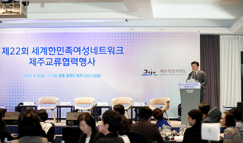 제주특별자치도는 8일 오후 메종글래드 제주 크리스탈홀에서 ‘2023 세계한민족여성네트워크(KOWIN) 대회’와 연계한 ‘제주 교류협력 행사’를 개최했다.
